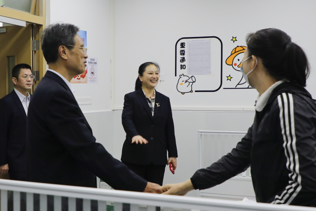 衷校长一行先到办公室对老师们进行慰问,与老师们亲切握手,关切地询问大家的工作和生活情况。衷校长对青年教师们寄予厚望,鼓励老师们努力钻研、不断精进业务能力;同时对骨干教师提出更高的期望,希望大家做好榜样与标杆,带好队伍,引领着学校的教育教学水平不断提升。