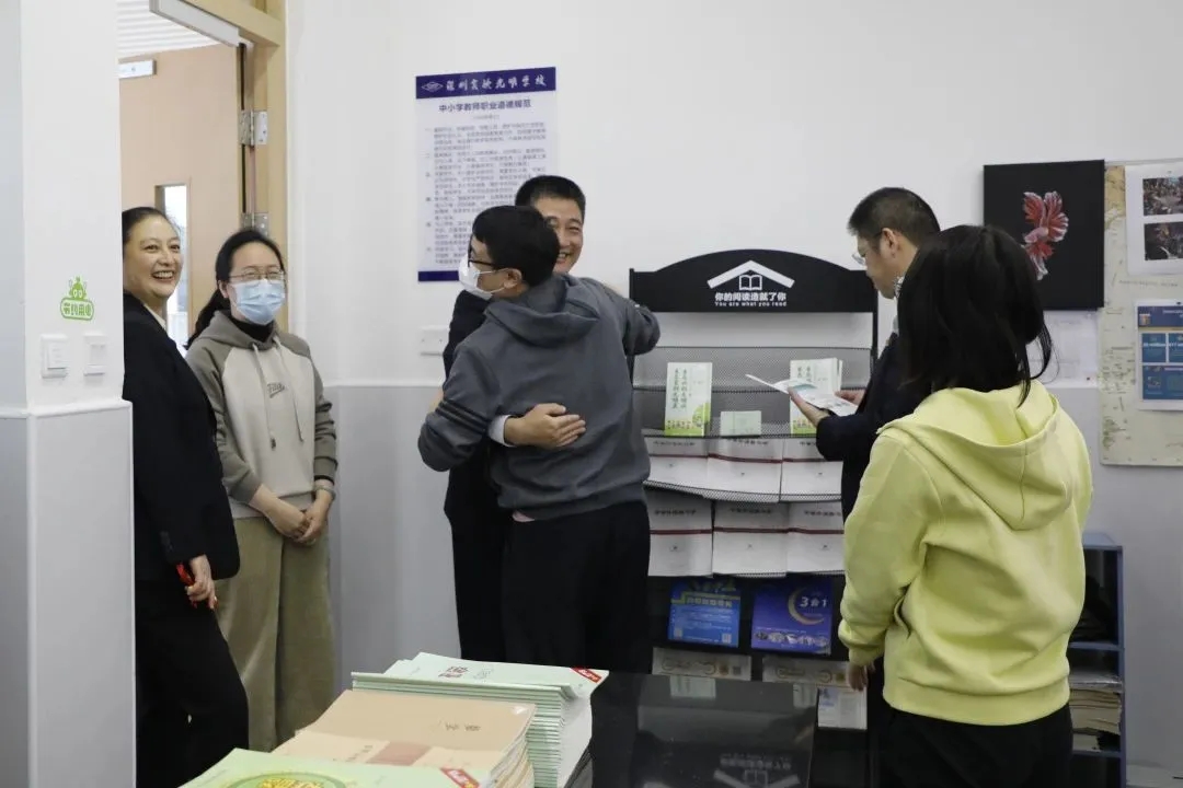 在九年级办公室里,衷校长给老师们鼓劲和加油,龙校热情地对老师们表达新学期的祝福,老师们与许久未见的王校热情地拥抱,表达想念。
