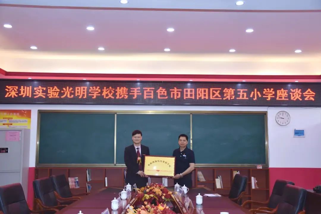座谈会结束后,深圳实验光明学校与田阳区第五小学举行了“粤桂两地结对帮扶学校”授牌仪式。