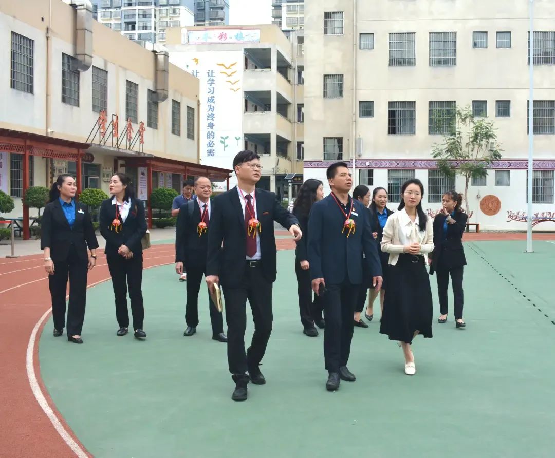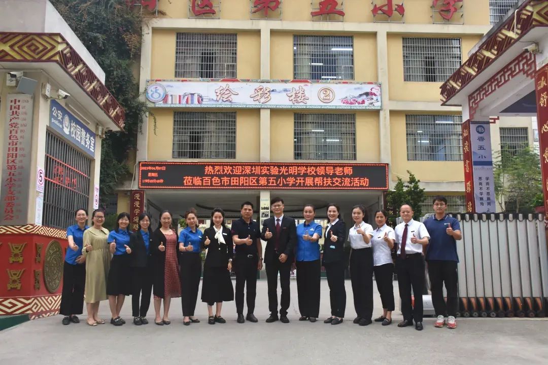 春日书香溢,春风送真情。为落实中共深圳市光明区委教育工作委员会的相关要求,充分发挥深圳市光明区现有教育资源优势,促进教育均衡与高质量发展,进一步加强百色市田阳区第五小学与深圳实验光明学校两校之间的教育教学交流,相互学习,携手共进,2023 年 4 月 7 日上午深圳实验光明学校朱灵辉校长一行 6 人到田阳区第五小学开展教育交流帮扶指导活动,百色市田阳区教育局教研室黄献良主任出席活动。