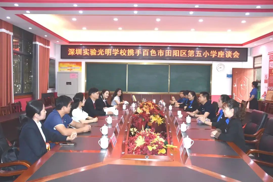 座谈交流会在田阳区第五小学三楼党员活动室召开。第五小学卢奂帆校长对深圳实验光明学校领导、老师的到来表示热烈地欢迎,向我们介绍了第五小学建校历史、办学特色、教育教学理念等情况,并期待两校之间有更深入的交流与合作。