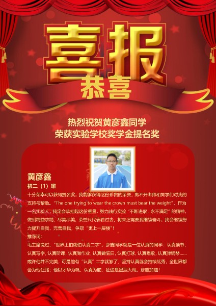 他认真读书,认真写字,认真听课,认真做作业,认真做值日,认真打球,认真唱歌,认真弹钢琴……毛主席说过“世界上怕就怕认真二字”。人无完人,但“认真”二字最珍贵,坚持认真就会持续优秀,全世界都会为他让路;他以才华为帆、认真为舵,征途是星辰大海。愿你成就为更优秀的自己!他就是八年级(1)班黄彦鑫!