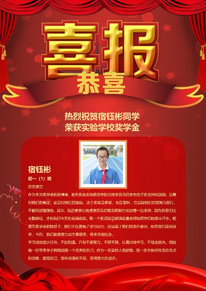 他,好学上进、关心他人、勇担责任、成绩优秀,他是一个对万事万物充满热情的人,尤其是班级事务总是积极主动地去参与。他的谦逊、诚恳给老师和同学们都留下深刻的印象,但他却常常在背后默默付出,默默学习。生活的路既美且长,以你的勤奋智慧和突出能力一直坚持下去,必是最闪亮的那颗星。他就是七年级(1)班宿钰彬!
