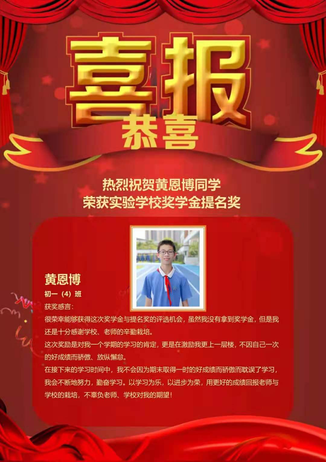 他善学乐学,勤奋踏实,是同学们学习上的榜样;他团结同学、真诚善良,是同学们生活上的朋友。一个学生能赢得众人的钦佩,不仅因为他成绩优异,更因为他在理智上求真,在品性上向善,在情感上育美。“取法其上,得乎其中;取法其中,得乎其下”,希望你能有更好的学习方法,学习上事半功倍!他就是七年级(4)班黄恩博!
