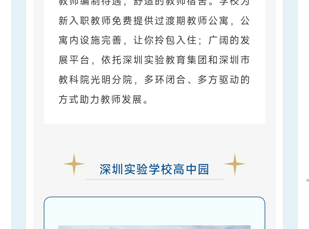 关于深圳实验教育集团招聘事宜,欢迎关注“深圳实验学校”公众号及官网www.szsy.cn。关于高中园招聘事宜,请关注“深圳实验学校高中园”微信公众号,及园区官网www.szsygzy.cn。