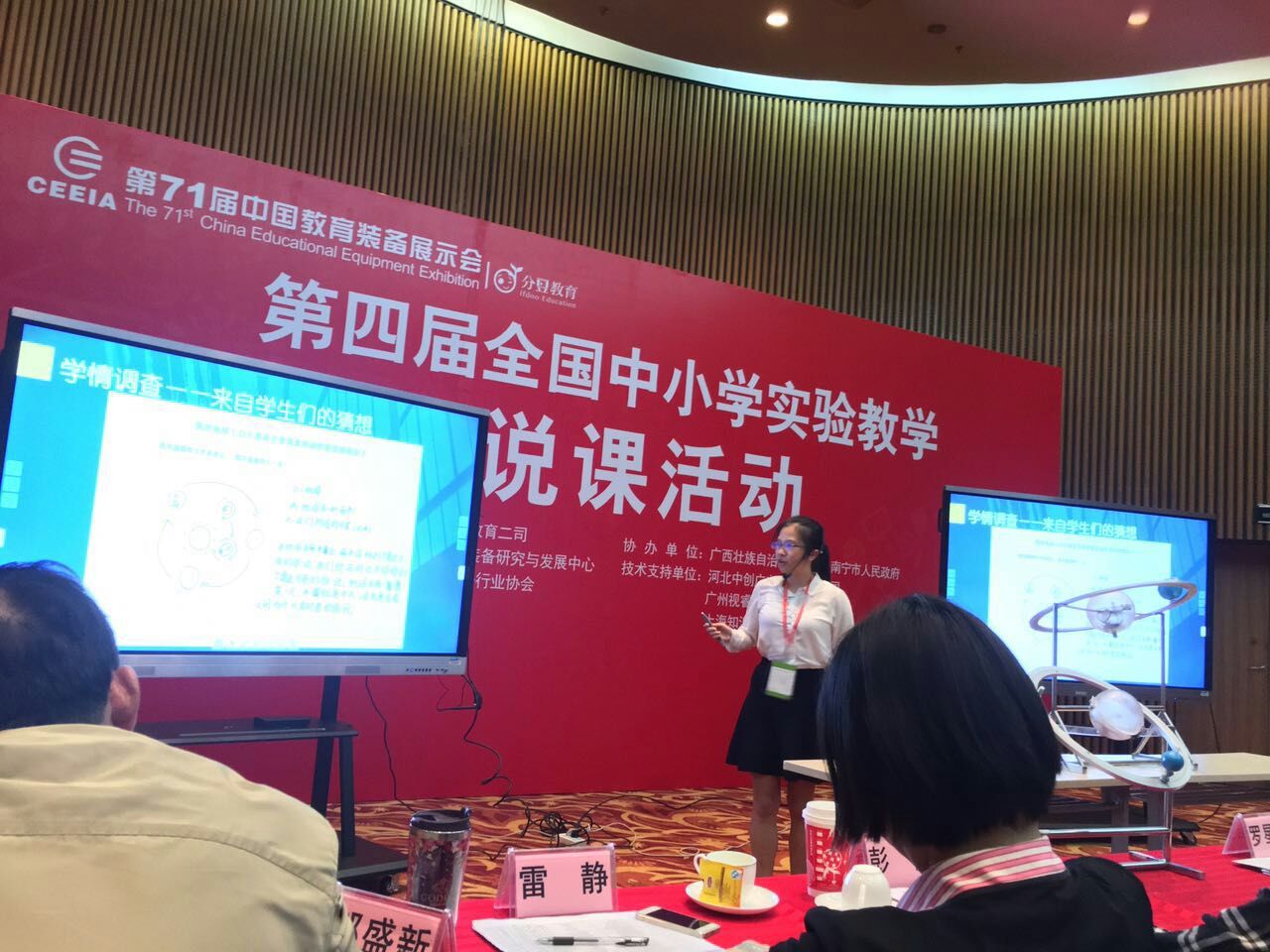比赛期间,评委们轮流传看习文老师自制的实验装置,对这种新型可完全自由组合的日地模型教具表现出很大的兴趣,对于实验教学的深度创新也给予了肯定。台下不少观赛教师也在比赛结束之后与习文老师共同探讨教具的制作细节和使用方法。