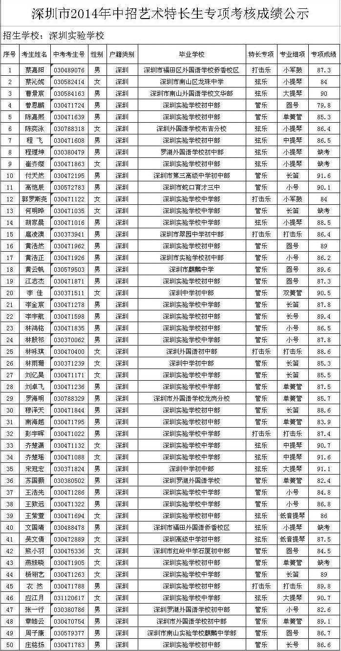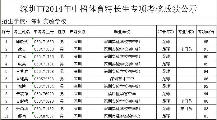 深圳市2014年中招体育、艺术特长生专项考核成绩公示