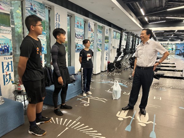 在陆上训练场地,夏育华书记与参训师生、教练亲切交谈,听取了俱乐部接待负责人对深圳青少年赛艇项目发展的介绍,了解教练团队情况及校队师生训练进度,为大家加油鼓劲,并送上慰问品。