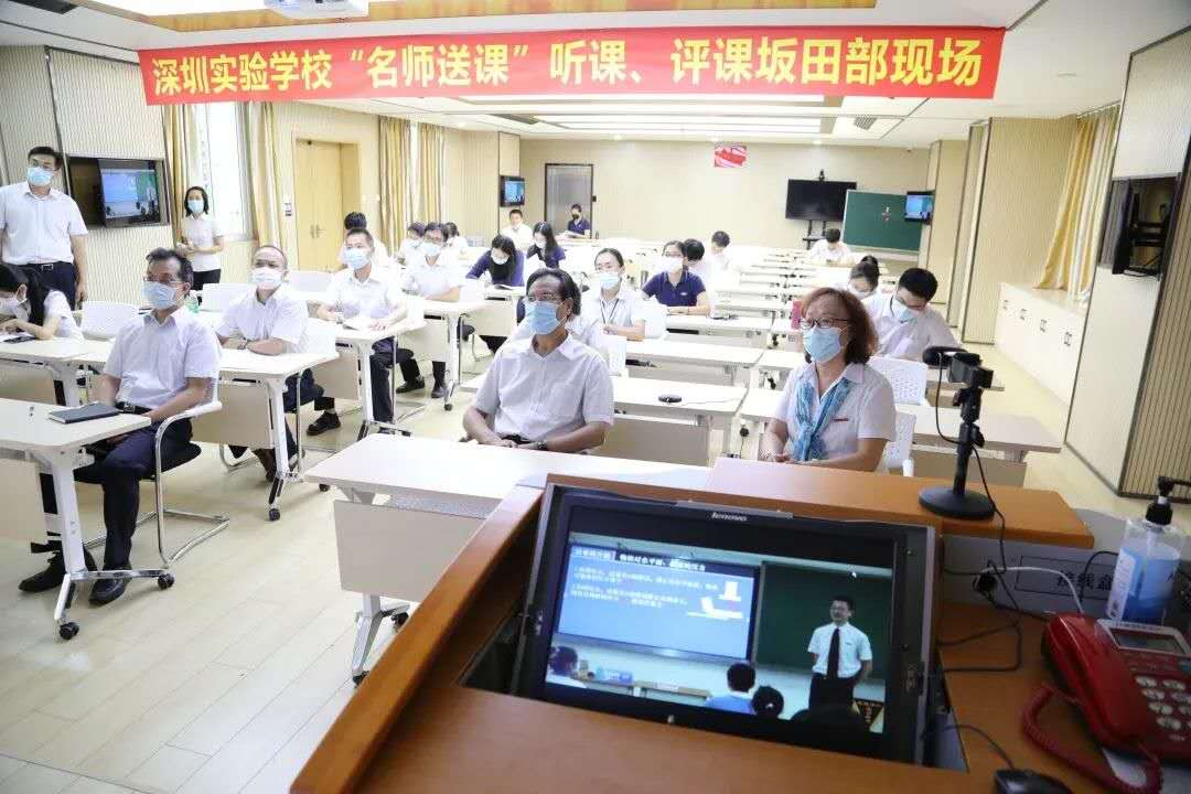 本次“名师送课”活动,采用现场直播方式进行。由光明部和坂田部设主会场,主会场为教学现场1个,评课现场1个,收看听课、评课直播现场1个。其他各学部均设听课、评课现场,收看主会场的现场教学和现场评课并参与互动交流。