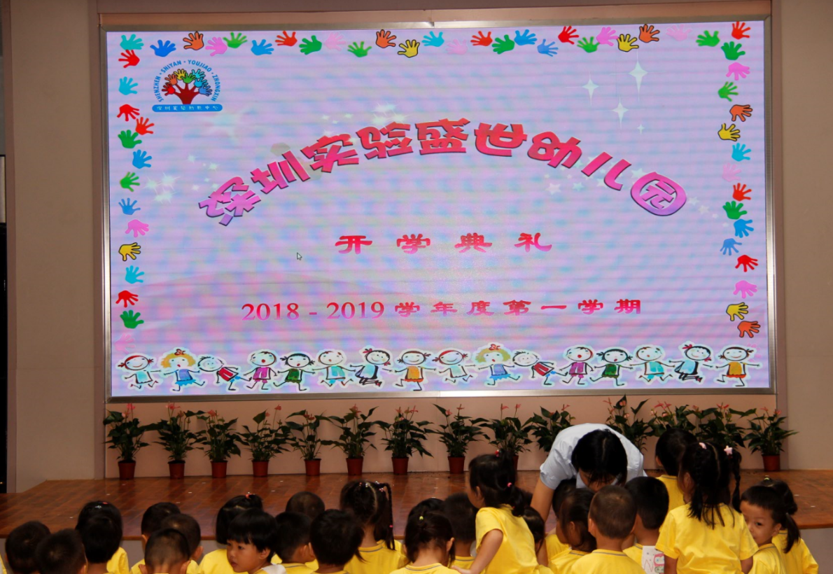 告别了充实而有意义的快乐暑假, 9月3日晨,在园长、老师和家委们问候声里,我们又相聚在美丽的幼儿园。大家惊喜的发现幼儿园大厅的背景墙已经变成了美观、大气的电子屏幕。