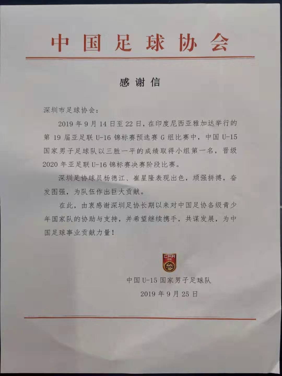 中国足协发来《感谢信》