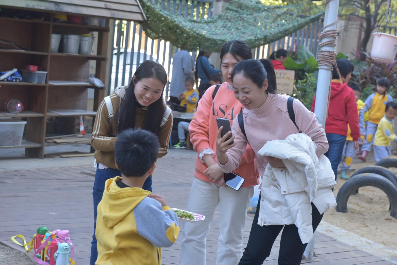 在户外,来宾们观摩了大班幼儿带小班弟弟妹妹的户外混龄游戏。在舞台上、草地上、沙池里、娃娃家、涂鸦区、建构区里……处处都有孩子快乐的笑声、专注游戏的画面,亦有大手牵小手的温暖。看着孩子们自发、自主参与游戏,她们表示我园的教育教学做得踏实、深入,值得学习和借鉴。
