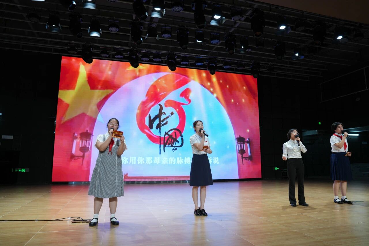 李笑梅执行校长携党员教师、共青团员以及少先队员代表,上台倾情献唱,演绎承前启后、矢志不渝的青春担当与家国情怀。用“党建带团建队建”的方式体现“传帮带”的精神力量,党旗所指,团旗所向,队旗飞扬,薪火相传续写华章!歌曲结尾,全体师生齐声高呼 “祖国放心,强国有我”铮铮誓言尽显实验人的使命担当!初一(12)班、(9)班、(2)班先后为国庆献唱,台下师生受其感染,高声和唱,“爱国情、强国志、报国行” 的种子深耕心底。