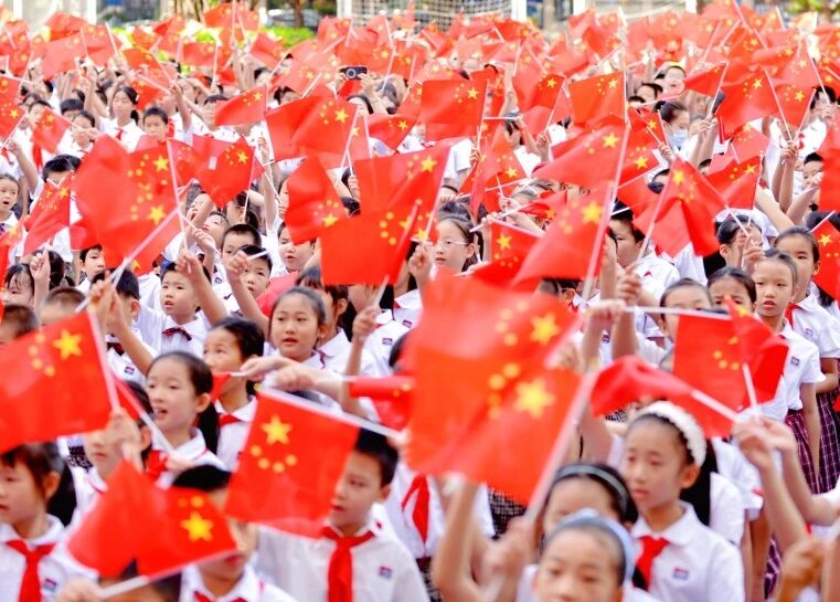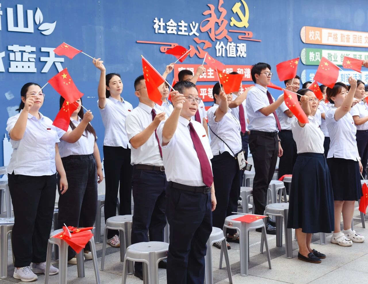 晨会最后,全场挥舞五星红旗,齐声高唱《歌唱祖国》,节日氛围达到顶点!
