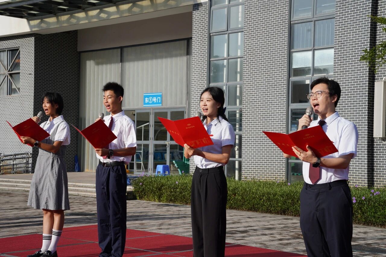 升旗礼毕,由苏岩老师执笔创作的原创诗篇《四秩校史承薪火,七六国诞焕荣光》在田径场上深情回响。黄吴悠、柯俊老师携高一12班黄泽馨、高一16班丘子洋同学共同朗诵,以声传情,以诗明志。诗句如泉涌,情感似潮生。朗诵者声情并茂,听者心驰神往,将全场氛围推向情感的高峰。