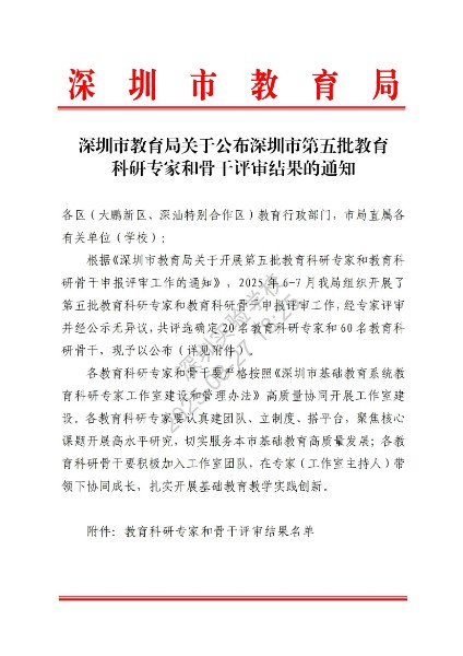 近日,深圳市教育局发文公布了深圳市第五批教育科研专家和骨干评审结果,我校於胜成、韦丽云两位老师获评教育科研专家,占全市获评总数的十分之一;丁伟老师获评教育科研骨干,占市直属学校获评总数的九分之一。