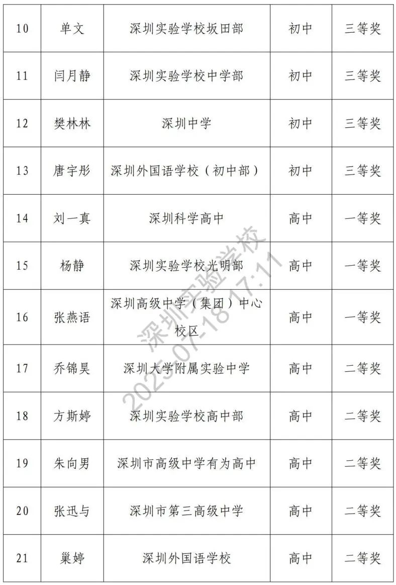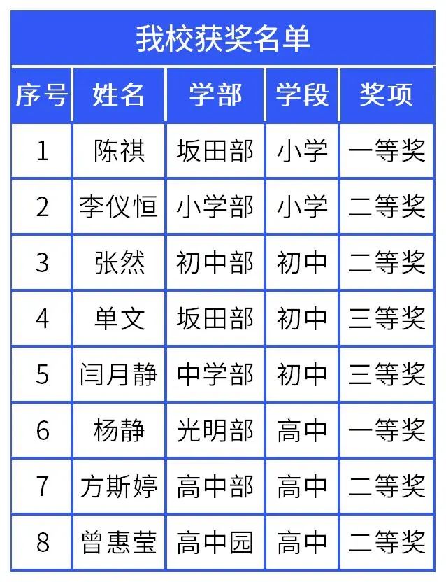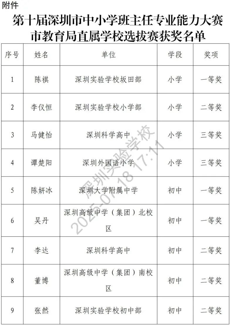 近日,市教科院公示了第十届深圳市中小学班主任专业能力大赛市教育局直属学校选拔赛评审结果,我校陈祺、杨静老师荣获一等奖,李仪恒、张然、方斯婷、曾惠莹老师荣获二等奖,单文、闫月静老师荣获三等奖。获奖人数占获奖总数的26.7%,一等奖获奖人数占一等奖总数的33.3%,两项排名均位列第一。
