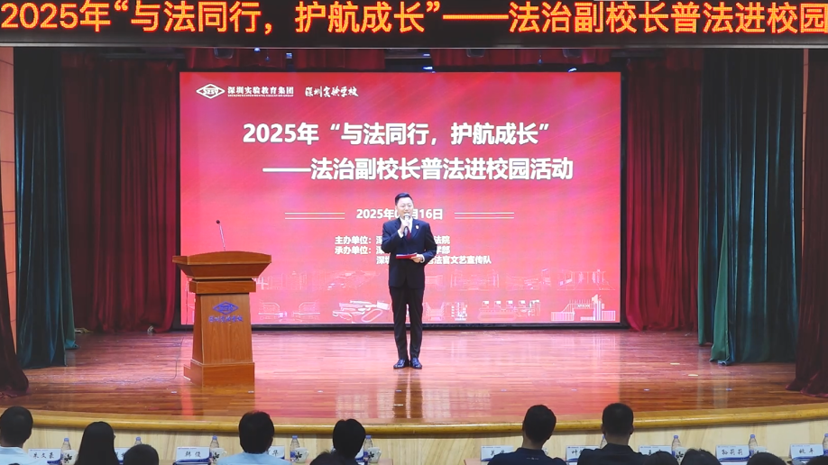 为深入贯彻落实习近平法治思想,弘扬法治精神,深化青少年法治教育,增强青少年法治意识,深圳市中级人民法院主办的2025年“与法同行,护航成长”法治副校长普法进校园活动于6月16日在我校中学部隆重举行。