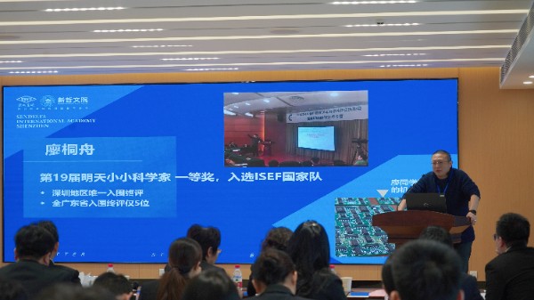 高中部办公室主任助理刘焱锋老师介绍了高中部一系列的科技创新教育举措,不仅注重师资队伍的建设,更在科技创新教育上取得了显著成效,使得高中部学子在各级各类比赛中屡获殊荣,为学部赢得了荣誉。