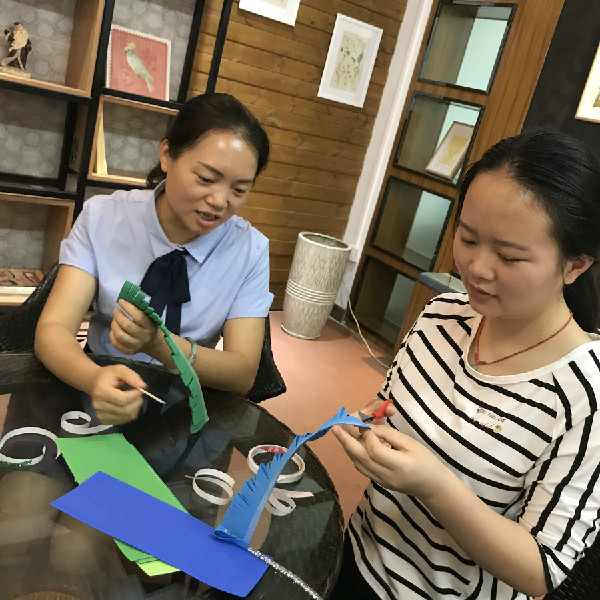 礼轻情意重,老师们围坐在一起,利用一些环保材料,你剪我撕她粘贴,一起为妈妈制作小礼物。