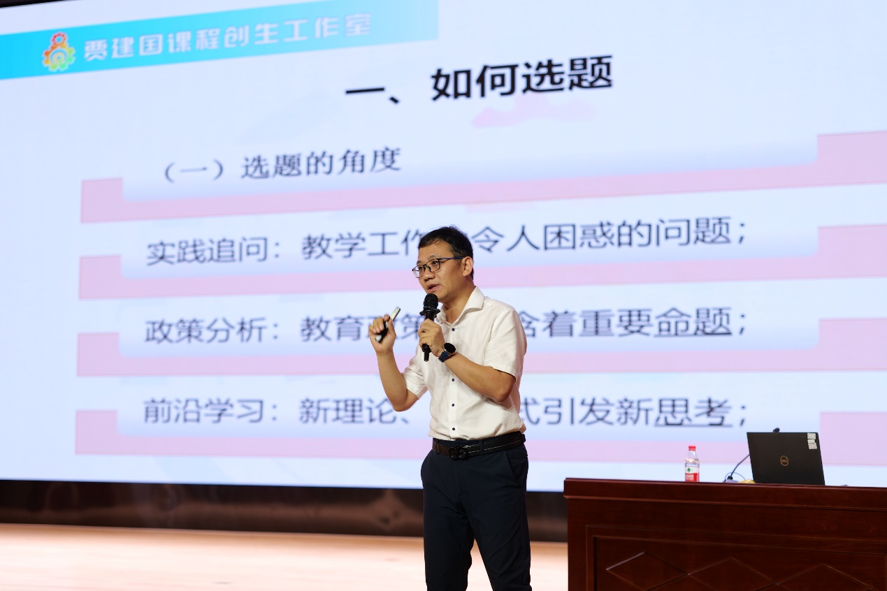深圳市教科院基础教育研究中心副主任贾建国研究员分享了如何进行课题研究的经验,从如何选题、如何设计、如何表达三方面进行了提纲挈领的指导,明确了一项好的课题研究应具备何种要素,为新教师开展教育研究夯实基础。