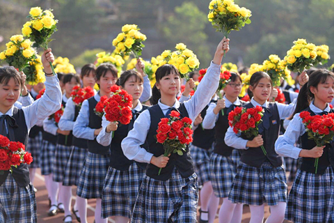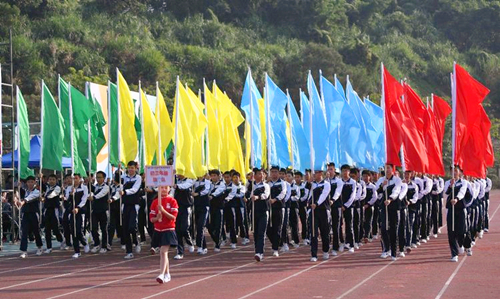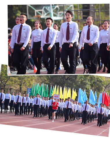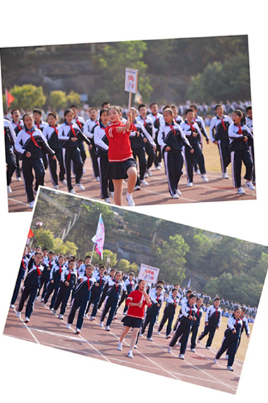 看!鲜艳的五星红旗在前面引路。在入场式进行曲嘹亮的音乐声中,国旗队、校旗队、会徽队率先走入会场,他们英姿飒爽,气宇轩昂。九年级花队热情洋溢,朝气蓬勃。七年级各班方阵入场时气势如虹,同学们高喊着响亮的口号,迈着矫健的步伐,展示出坂田校区学生积极进取、奋发向上的精神风貌。八年级的班级风采团队展示,更是给来宾观众们留下了深刻印象。高亢响亮的口号,整齐划一的动作,变化多样的队形,无限创意的表演,散发着青春的朝气,体现出昂扬的斗志!年轻帅气的裁判员们着装整齐,步伐坚定,昂首阔步,赢得观众们阵阵热烈的掌声。九年级彩旗队员朝气勃勃,气势如虹,彩旗飘展,青春飞扬!