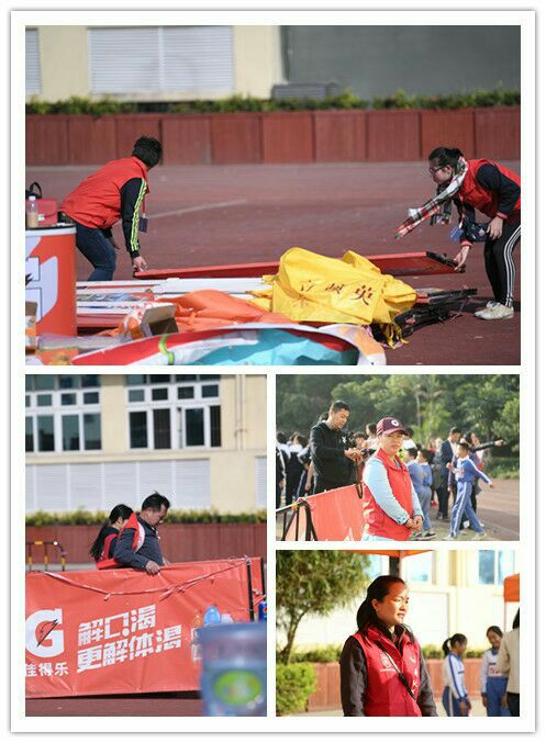 赛场上竞争激烈,观赛的同学们自觉有序,为运动员加油鼓劲。身穿红马甲的家长义工们为了本届运动会的顺利举行不辞辛苦,为孩子们的安全保驾护航。