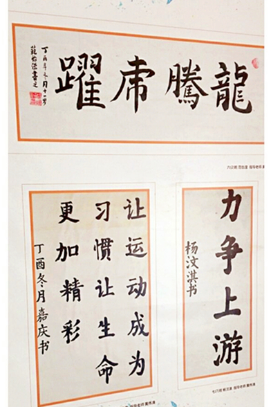 本次体育文化节不仅有田径场上的竞技比赛,还有体育文化的展示。学校举办了以“我爱运动”为主题的书画展,与本次体育文化节有关的书法作品、班徽设计以及各种形式的绘画作品,吸引了众多师生与家长的目光。
