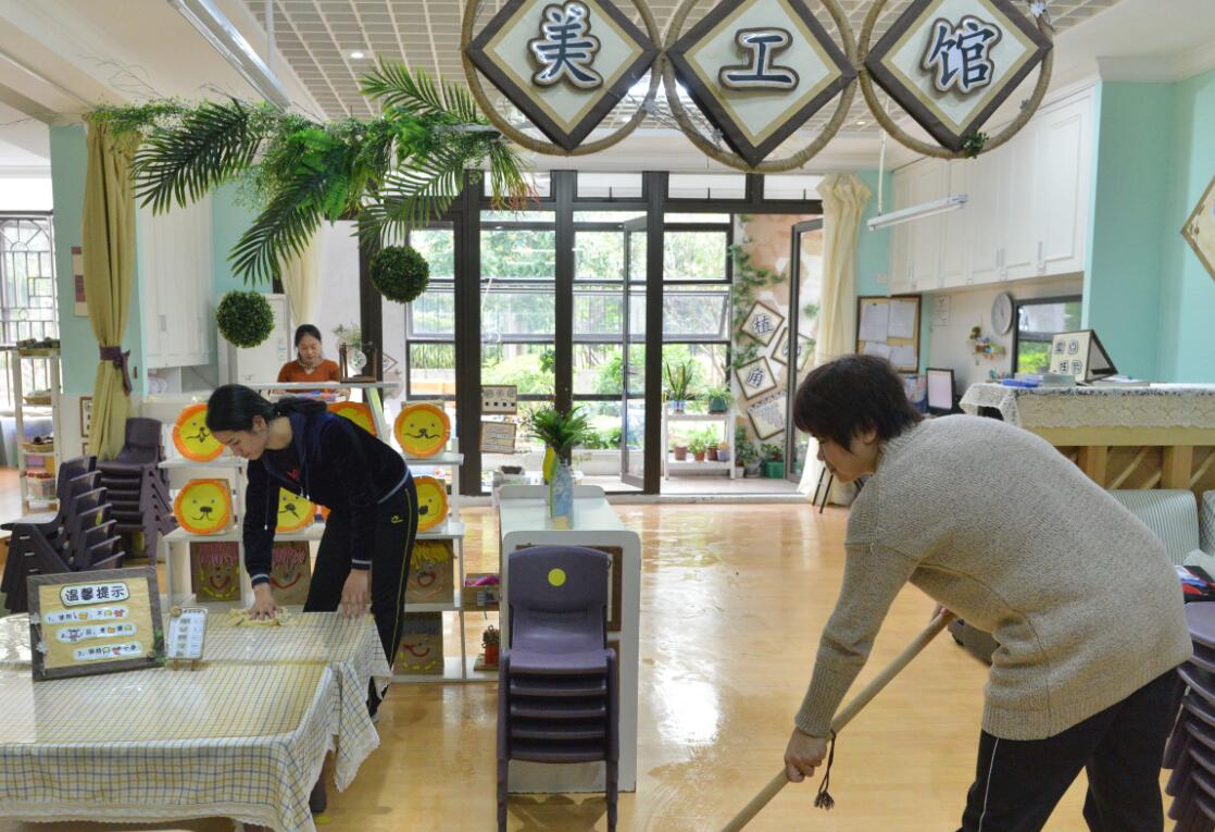 “洗”旧迎新,经过一个假期,教室里沉落了些灰尘,为给孩子一个整洁干净的环境,忙碌的身影处处可见。操场上散落一些枯叶、体育器械上的一层层的尘土,在老师们的努力下,教室里、户外环境和体育器械都焕然一新,迎接宝贝们回家。