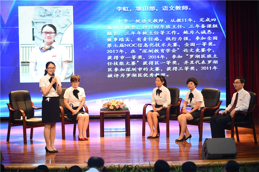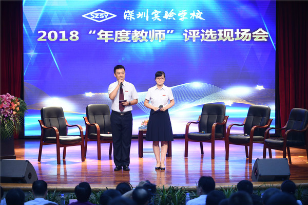 7月11日下午,深圳实验学校2018“年度教师”评选大会在中学部小礼堂隆重举行。学校领导、各部专职教师参加大会,共同期待并见证了“年度教师”产生的过程。来自各部的“年度教师”候选人闪亮登场,分别是坂田部的李虹老师、小学部的袁圆老师、初中部的胡晓江老师、中学部的潘浩老师和高中部的徐怡华老师。他们将参加三个环节的现场比拼,由七位专业评委现场打分,最后综合个人业绩材料、小组讨论和演讲与答辩三项的评分,评选出深圳实验学校2018“年度教师”。大会由中学部杨宁、熊珊老师主持。