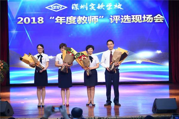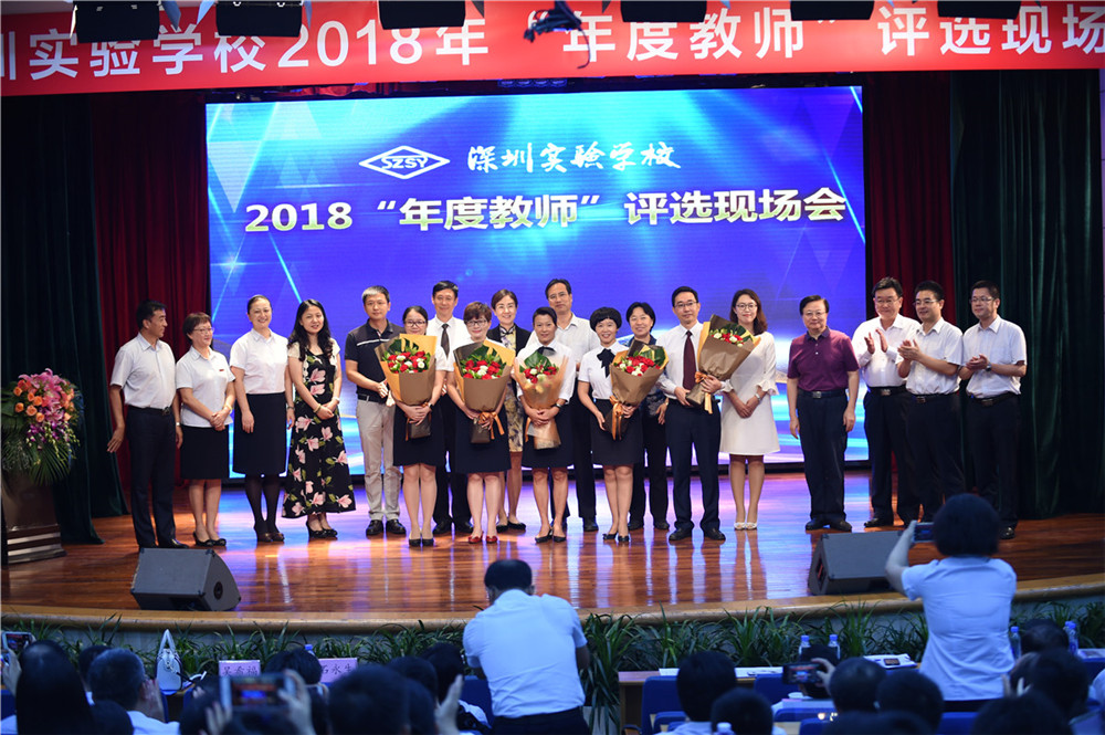 正如评委所说,实验学校老师就是专业优秀、气质不凡。五位候选人台上选手表现可圈可点,对问题剖析深入,现场答辩精彩,教育故事感人,表现出扎实的专业功底、独到的教育智慧和教育风格。台下观众参与积极性高,掌声、笑声和欢呼声,呼应着选手们的精彩发挥,现场气氛热烈。经过两个小时紧张激烈的比赛,最终,高中部徐怡华老师脱颖而出,荣获得深圳实验学校2018“年度教师”;小学部袁圆老师、中学部潘浩老师、初中部胡晓江老师、坂田部李虹老师,荣获深圳实验学校2018“年度教师”提名奖。评委组组长、深圳市教科院李桂娟副院长现场宣布评选结果。少先队员为五位获奖教师献上鲜花。五位获奖教师与评委组全体专家、学校领导合影留念。