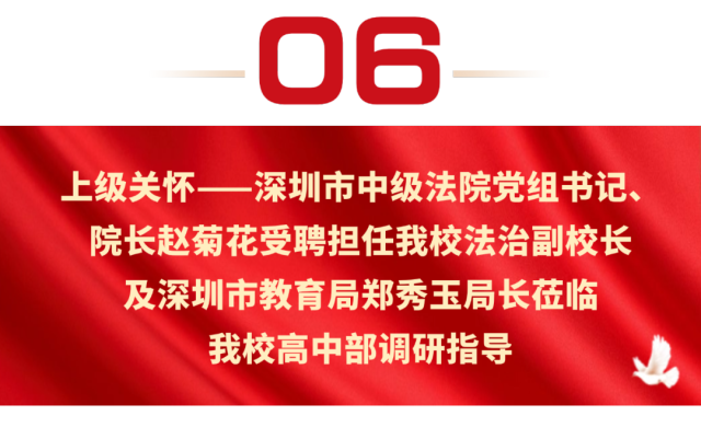 4月,深圳市中级法院党组书记、院长赵菊花受聘担任深圳实验学校法治副校长,深圳市教育局郑秀玉局长莅临深圳实验学校高中部调研指导;5月、8月、9月,深圳市教育局副局长钟义应分别莅临坂田部、小学部、高中部调研学校建设及安全工作,并给予切实指导;11月12日,深圳市第七届人大代表陈晓云、市教育局钟义应副局长一行莅临小学部调研午餐午休工作;12月18日,团市委胡火明书记一行来深圳实验学校调研指导。