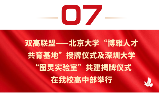 3月7日,光明部与华南师范大学政治与公共管理学院正式签约,共建校外实习与实践教学基地;4月,北京大学“博雅人才共育基地”授牌仪式在深圳实验学校高中部举行,同月还举行了深圳大学“图灵实验室”共建揭牌仪式;5月7日,高中部与华南师范大学化学学院举行“研究生实践教学基地”签约暨授牌仪式;5月11日,同济大学党委书记方守恩莅临深圳实验学校,授牌高中部“卓越生源基地”;6月19日,高中部被中山大学授予“国家优秀中小学教师培养计划”联合培养实践基地;12月10日,光明部与深圳综合粒子设施研究院,成功举行战略合作框架协议签约仪式,共同创办STEAM创新实验室;12月11日,华南师范大学生命科学学院与光明部共建研究生联合培养基地正式签约。