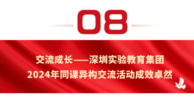 3月14日,深圳实验教育集团2024年同课异构交流活动启动;全年,深圳实验学校在小学三年级、小学六年级、初中一二年级、高中一二年级语文、数学、英语、体育、美术等12大学科领域,共举办了38场同课异构交流活动,吸引了128名教师登台竞技,展现了教师们的教学风采和创新精神;5月28日上午,集团召开心理工作汇报会,加强对各学部心理健康工作的指导,为提升全校师生的心理健康水平保驾护航;11月4日—10日,深圳实验学校6名教师赴新疆喀什开展教育教学交流活动,实现了教育资源的共享与互补,开创了学校教育教学交流新局面。