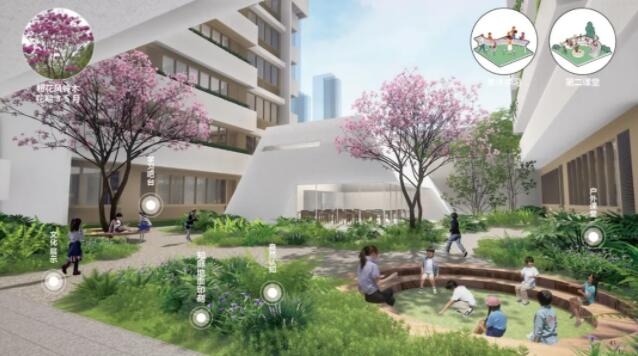 它们分别是位于教工宿舍楼、图书馆、运动场区域的怡心园,思博园与畅跃园。在这里,师生可以倾心地交流、静静地读书、纵情地运动。其是对应深圳实验学校校风、教风与学风的“三风园”。