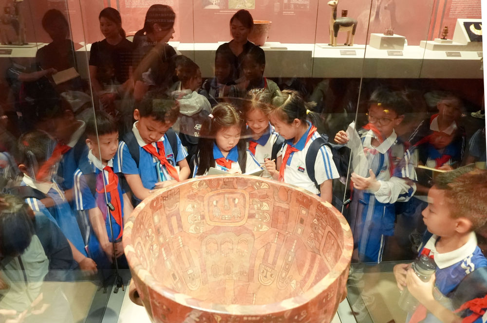 展厅内,讲解老师从印加文化的前世今生开始,深入浅出地介绍了印加文化的雕刻艺术、陶器、纺织品以及金属制品,以及这些展品背后代表的神灵崇拜、祖先崇拜、自然崇拜等,带领孩子们开启了一段奇妙的印加之旅。大家被独特神秘的印加文化深深吸引,时不时举手提出疑问,同时对照观展探索手册进行简单地记录。讲解结束后,孩子们以小组为单位集合,对探索手册中的一些问题开展讨论,遇到意见不一致时,孩子们再次回到展品前寻找答案。