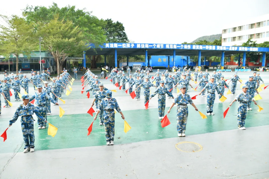 旗语方队,同学们手持鲜艳的旗帜,迈着整齐的步伐走向场地中央。“向右 —— 转!” 随着教官的口令,同学们迅速转身,旗帜在空中划出整齐的弧线。他们通过旗语传递着 “热爱祖国”“保卫和平” 的信念,