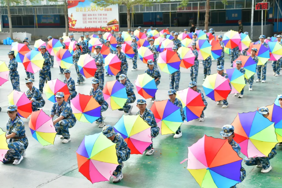 “彩虹伞方队” 的登场让现场气氛更加热烈。巨大的彩虹伞在同学们的手中缓缓展开,红、橙、黄、绿、青、蓝、紫七种颜色交织在一起,宛如一道绚丽的彩虹降临操场。同学们随着音乐的节奏,挥舞着彩虹伞,时而高高举起,形成一片彩色的海洋。