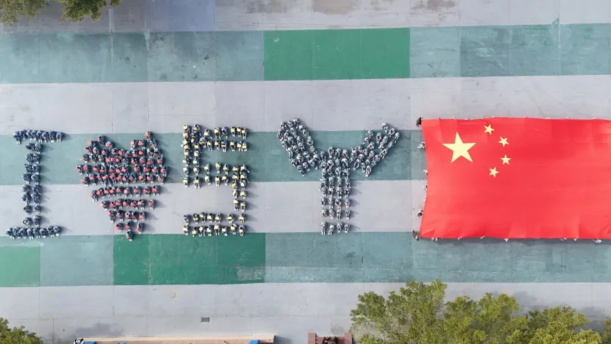 最令人动容的环节当属大国旗展示。巨大的国旗在同学们的簇拥下缓缓入场,同学们迈着坚定的步伐,神情庄重而自豪。随着队形的变换,“我爱实验” 逐渐呈现,字体整齐规范,饱含着同学们对学校的深厚情谊。