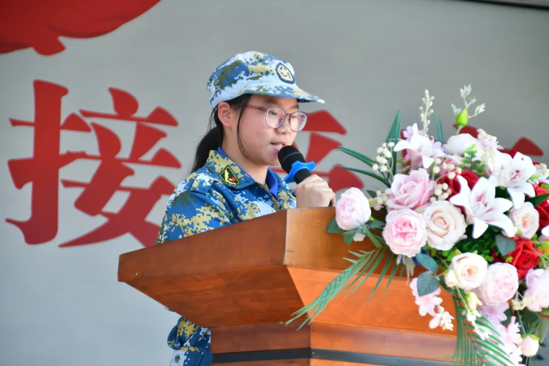 学生代表七(4)班何孝容同学发言:我们将以饱满的热情和昂扬的斗志投入到训练中去,严格遵守纪律,听从教官的指挥,认真学习军事技能,努力提高自身素质。我们将尊重教官,团结同学,互帮互助,共同进步。