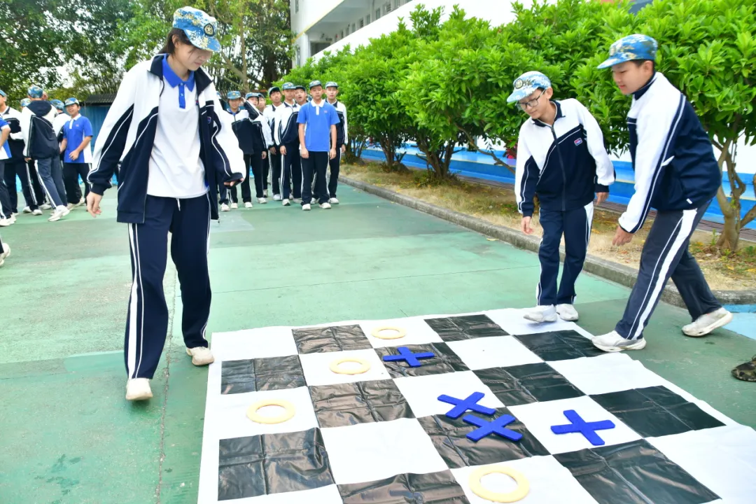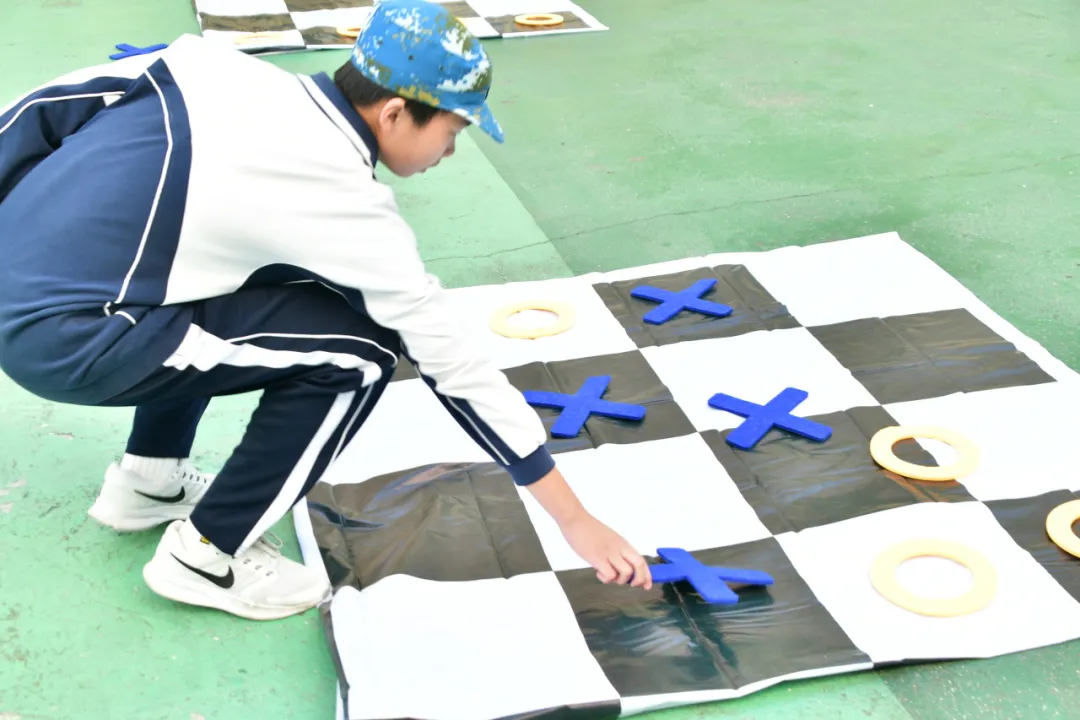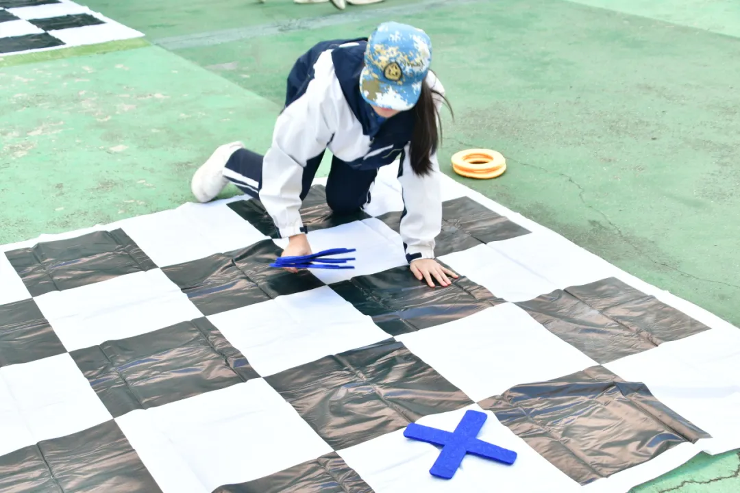与传统五子棋棋盘不同,本次活动的道具是巨型喷绘棋盘和彩色棋子,同学们需分组协作,通过奔跑、传递棋子完成布局。各小组围在喷绘棋盘旁,时而低声商议策略,时而快速穿梭摆放棋子,场上欢呼声、呐喊声此起彼伏。