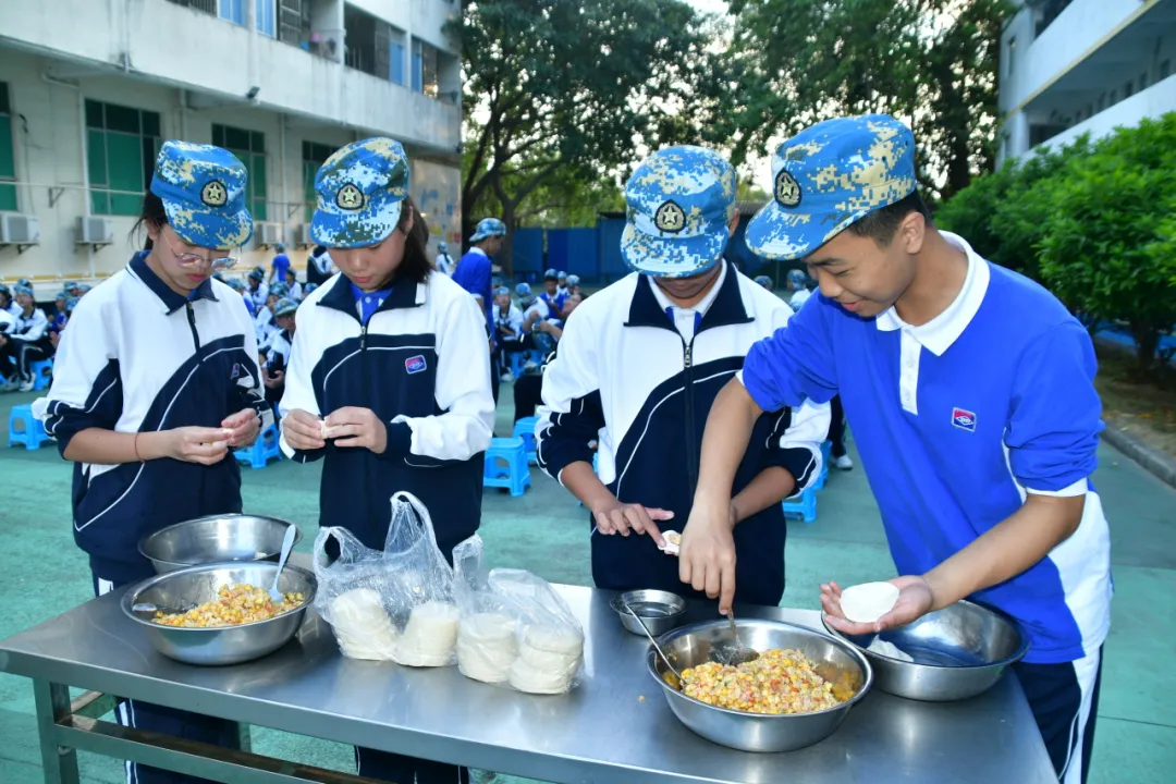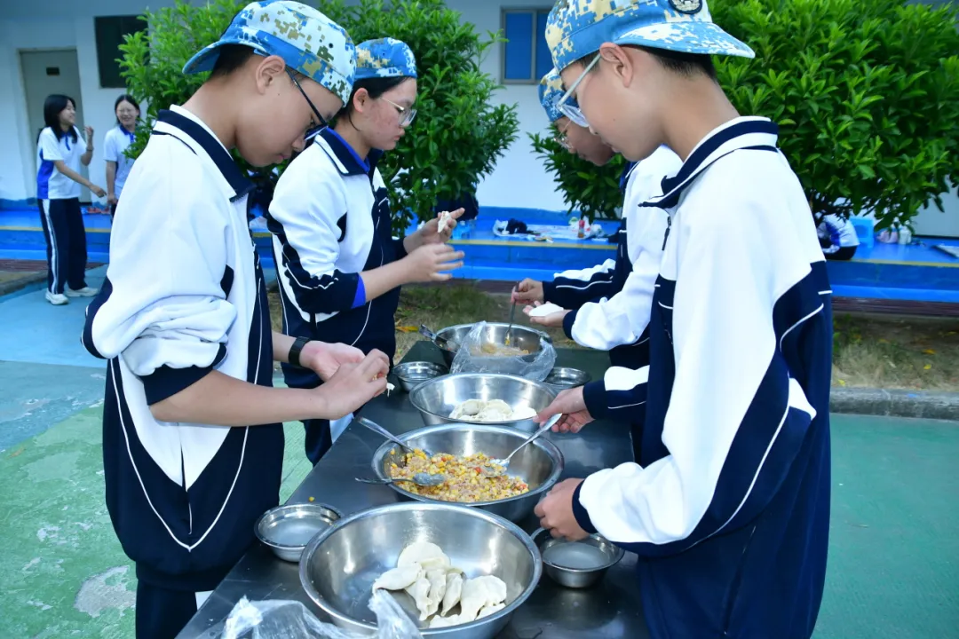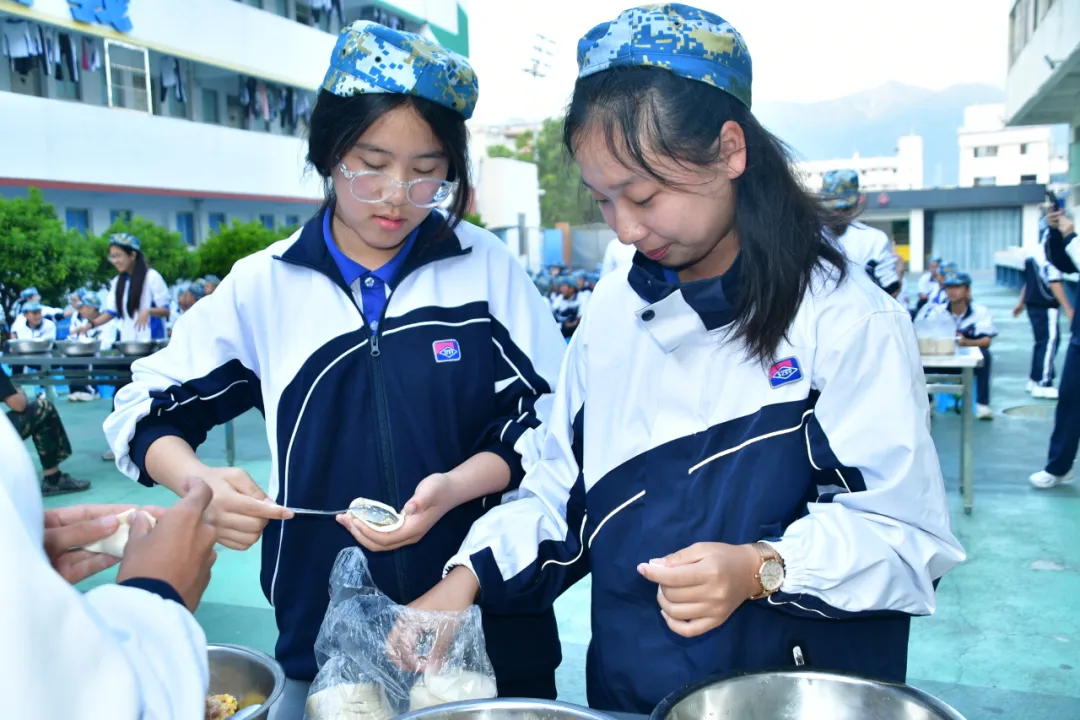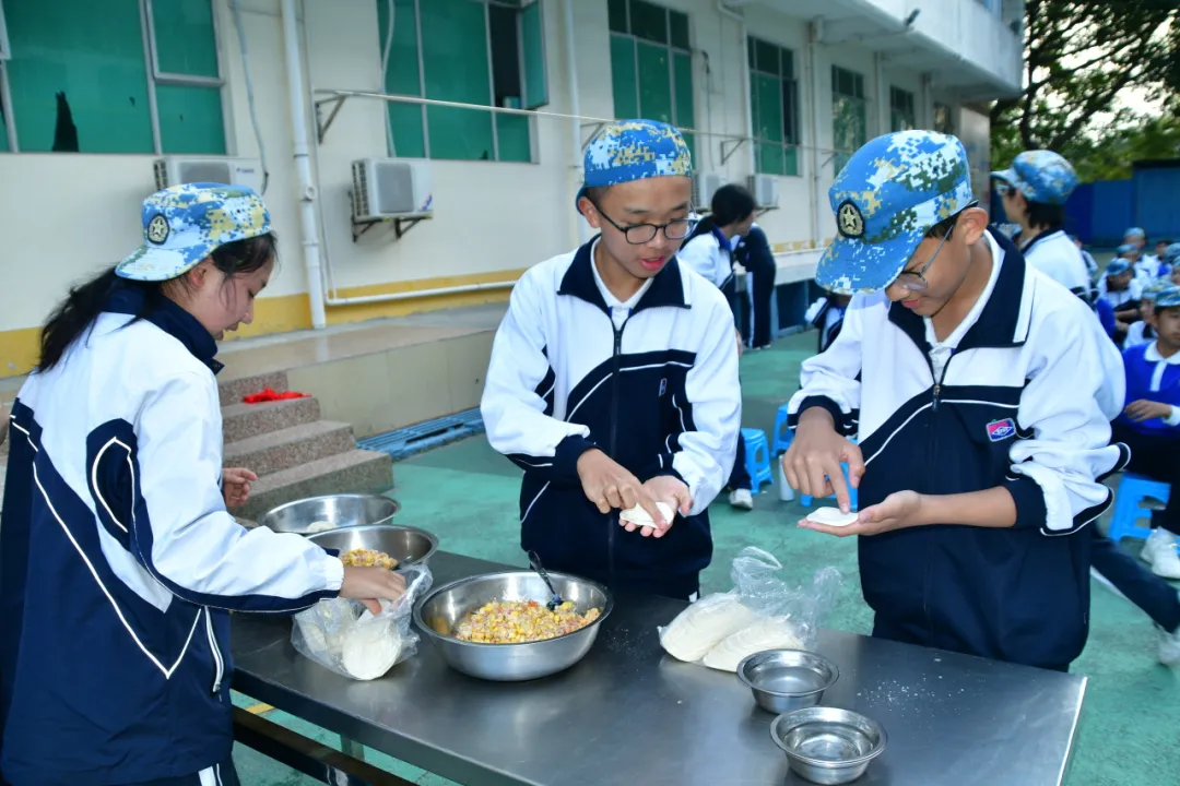 包饺子活动正在温馨进行。餐桌上摆放着雪白的面团、新鲜的馅料和整齐的餐具,同学们围坐在一起,分工合作。教官手把手地教同学们包饺子:“捏饺子的时候要用力一点,不然煮的时候容易破。” 同学们学得有模有样,欢声笑语充满了整个场地。