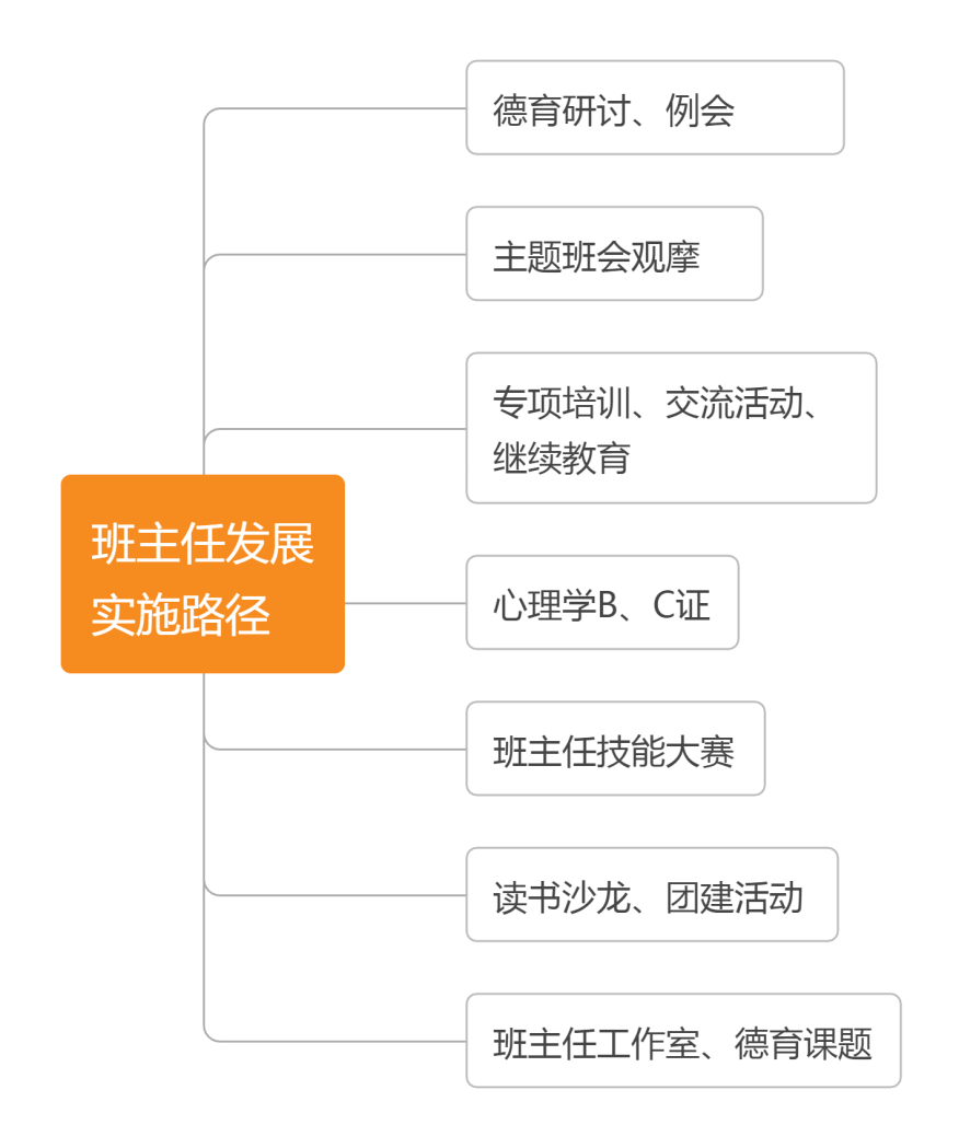 班主任是班集体的组织者、领导者、教育者,是学校管理和德育工作的中坚力量。为了打造一支政治思想过硬、专业能力突出的班主任团队,围绕专业情怀、专业知识、专业能力进行班主任团队培训,以德育研讨、班会观摩、班主任技能大赛、读书沙龙、班主任工作室为班主任发展实施路径,将班主任培养常态化、制度化、专业化。