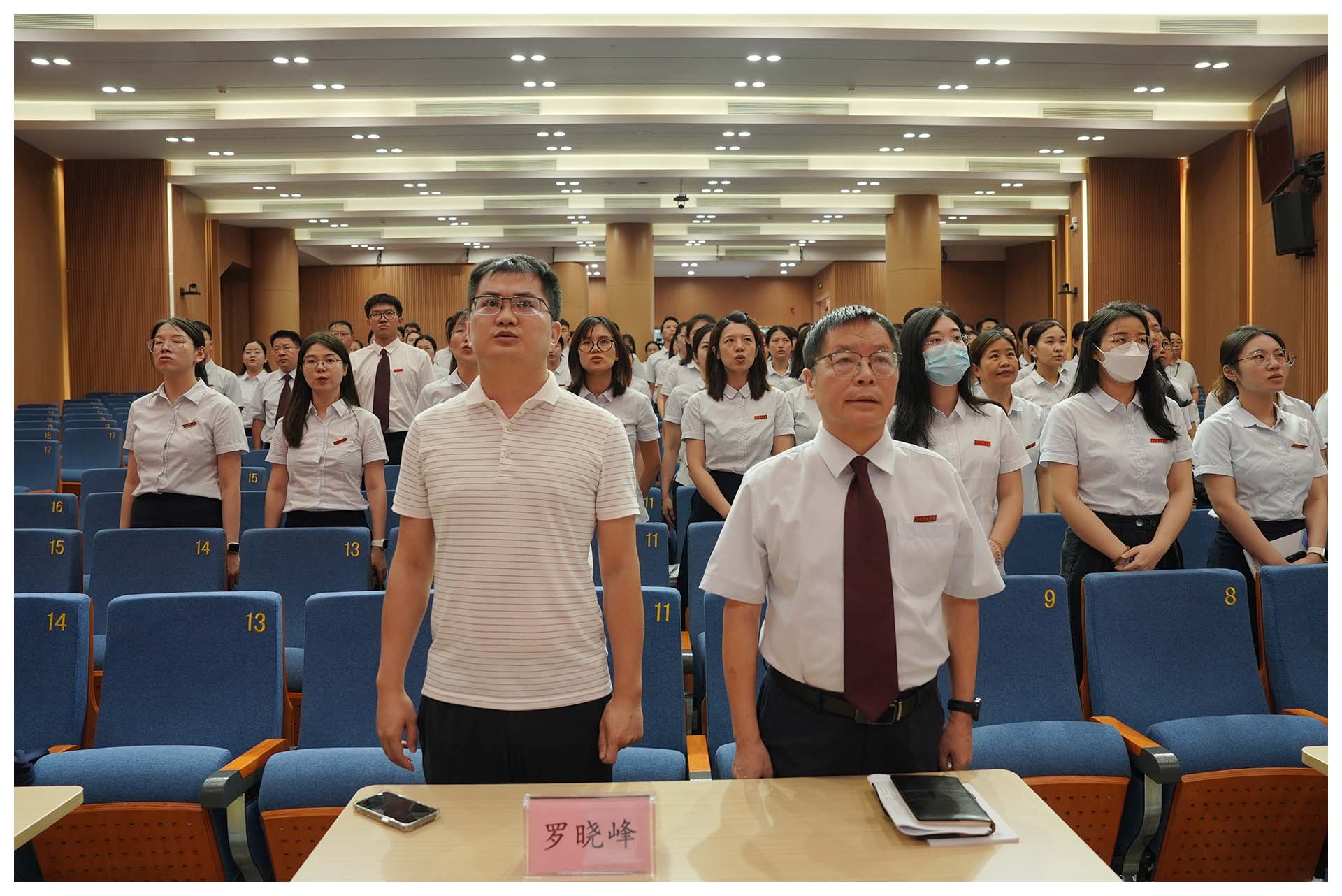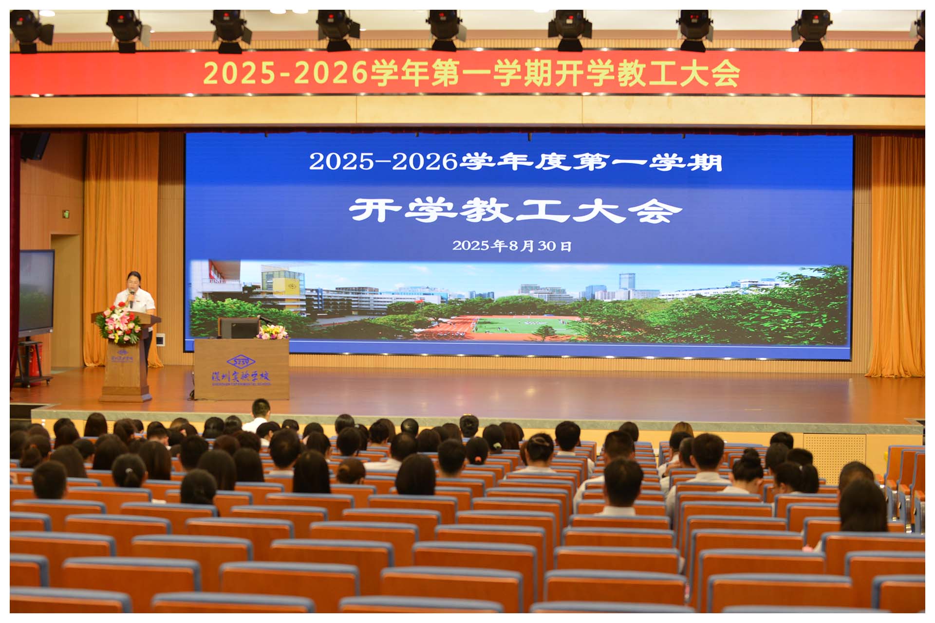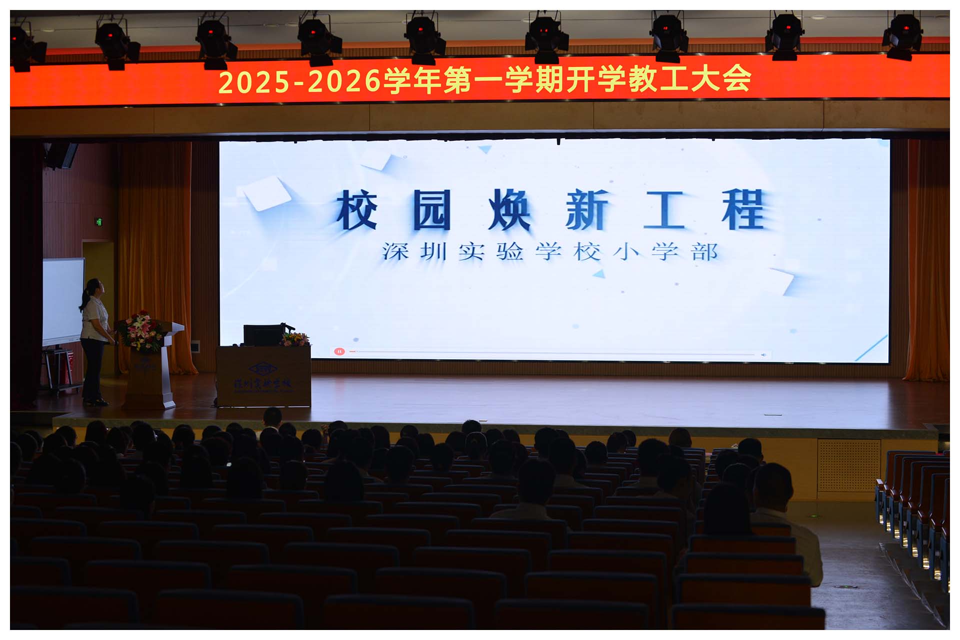 下午2:30,2025-2026学年第一学期开学教工大会在青禾梦剧场正式召开。大会在庄严的国歌声中开幕,全体教工肃立齐唱,展现实验人的昂扬风貌。随后,大家共同观看青禾梦剧场“焕新工程”纪录短片——这座始建于1995年、2018年暂别使用的剧场,在夏育华书记的擘画、吴立新执行校长的统筹、总务处的协调推进下重焕新颜。它不仅是一次硬件升级,更是学校优化育人环境决心的体现。