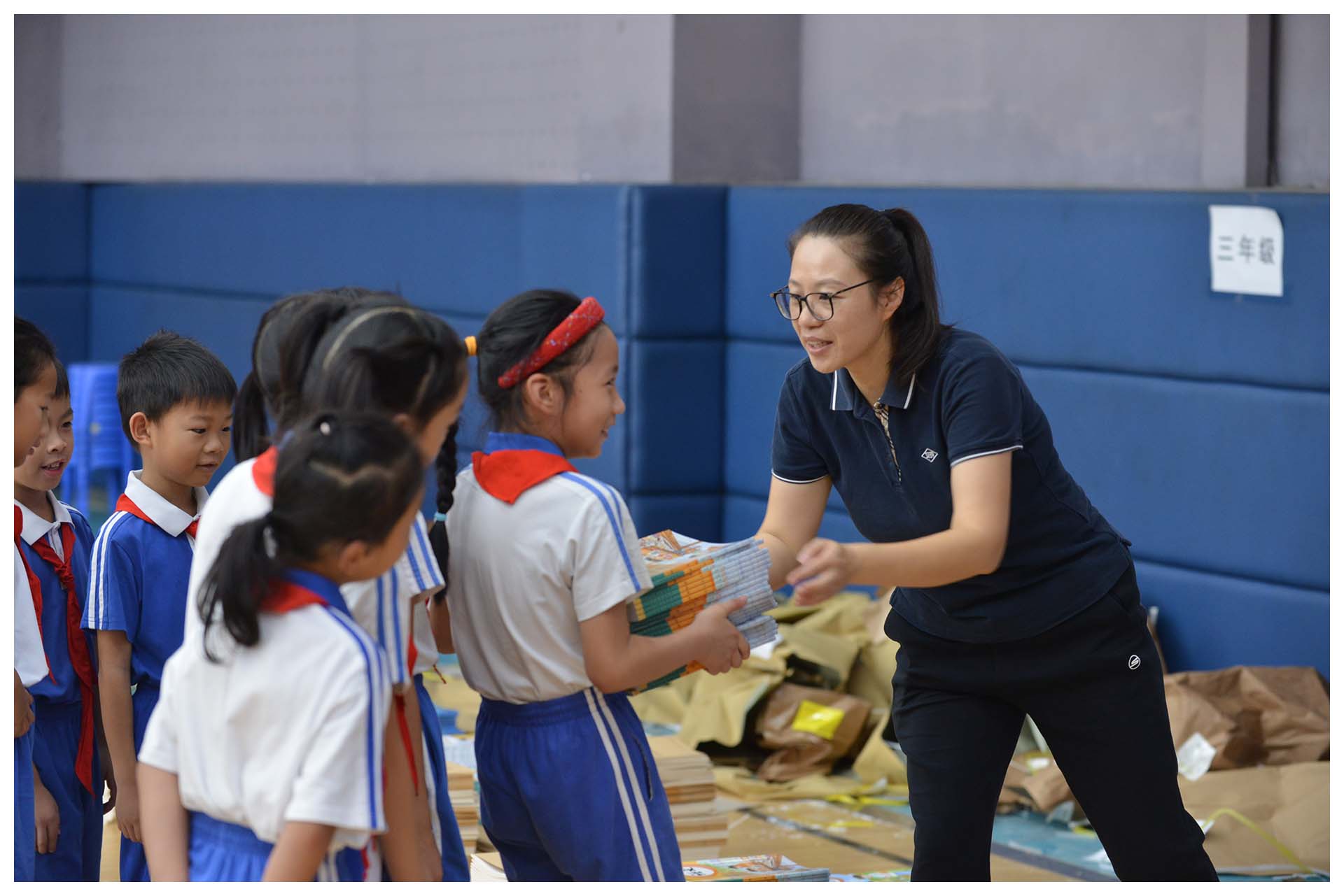 早晨8时10分,校门口已洋溢着欢声笑语——高年级同学主动帮助低年级学弟学妹提书包,班主任们站在教室门口热情相迎,“好久不见,你长高啦!”“暑假去哪里玩了呀?”亲切的问候让校园充满温暖。各班有序开展学前教育,班主任组织学生收交假期作业、分享假期生活。二至六年级学生代表前往体育馆领取新教材,孩子们手捧崭新的书本,迫不及待地翻阅,轻声交流着新发现。