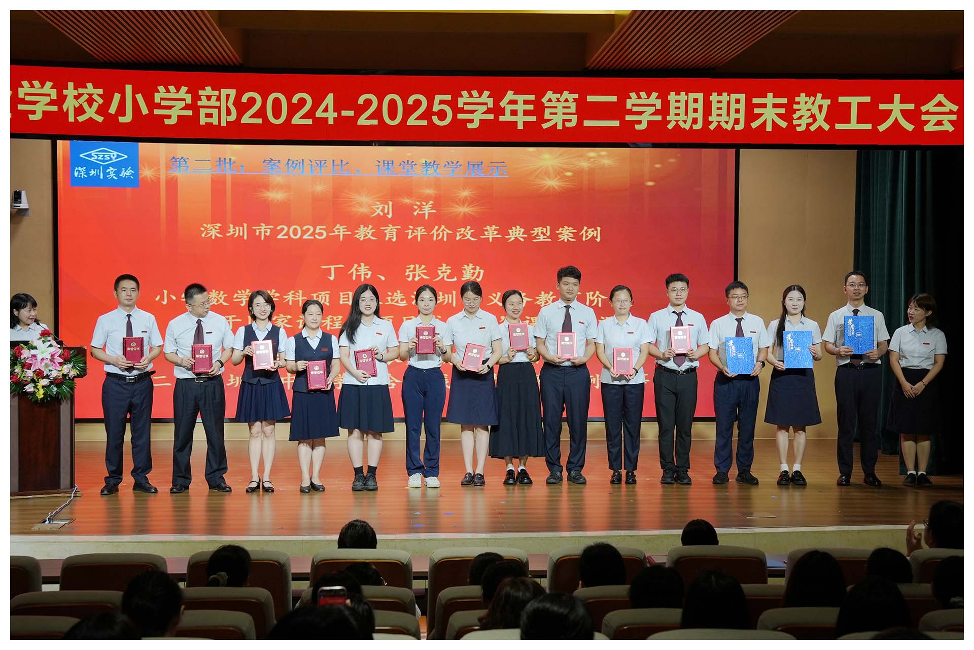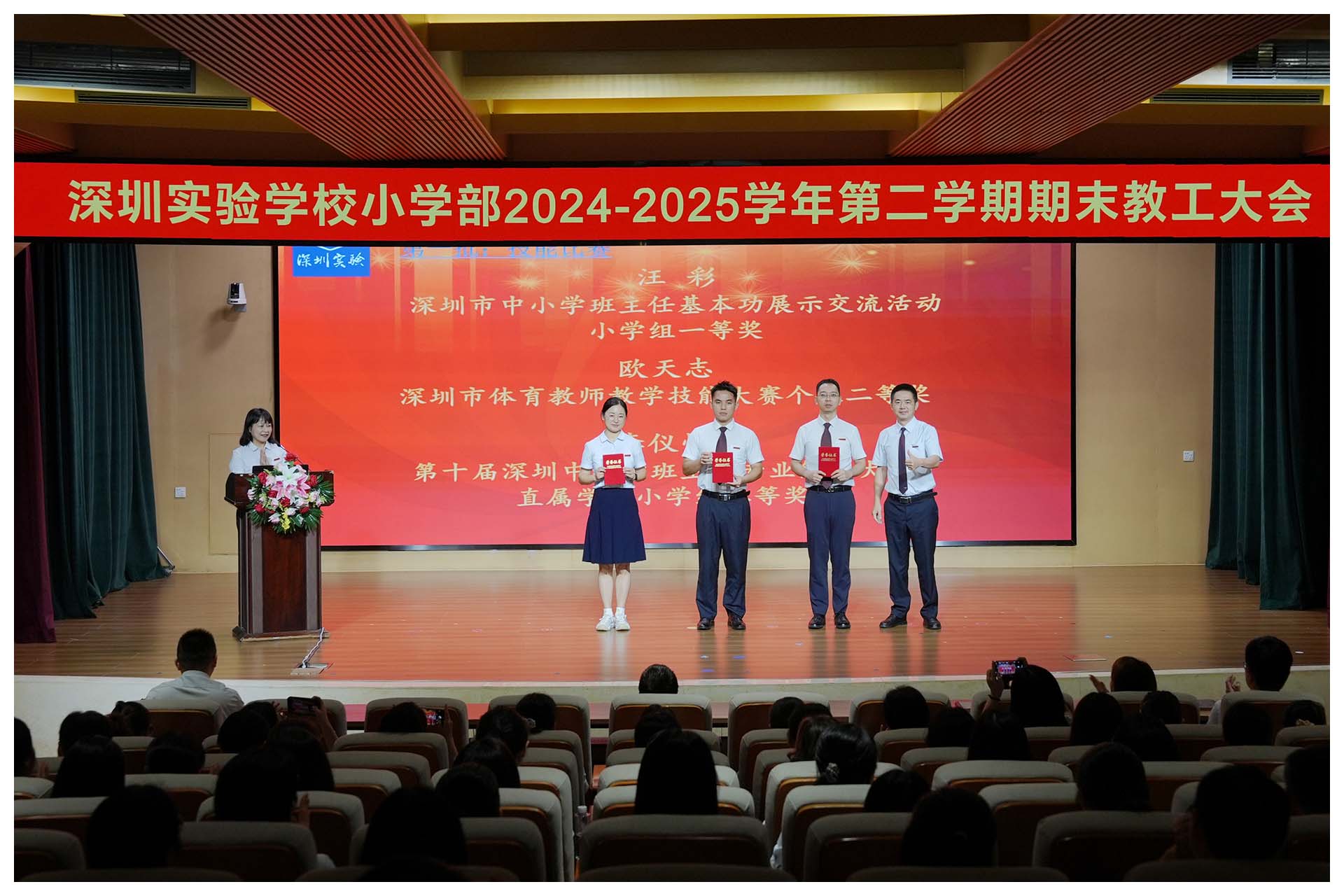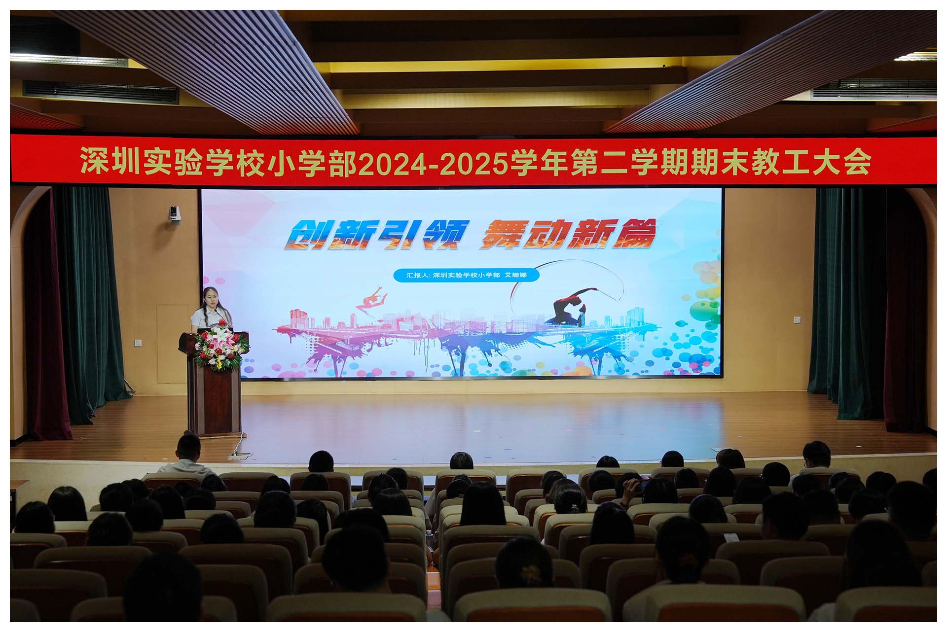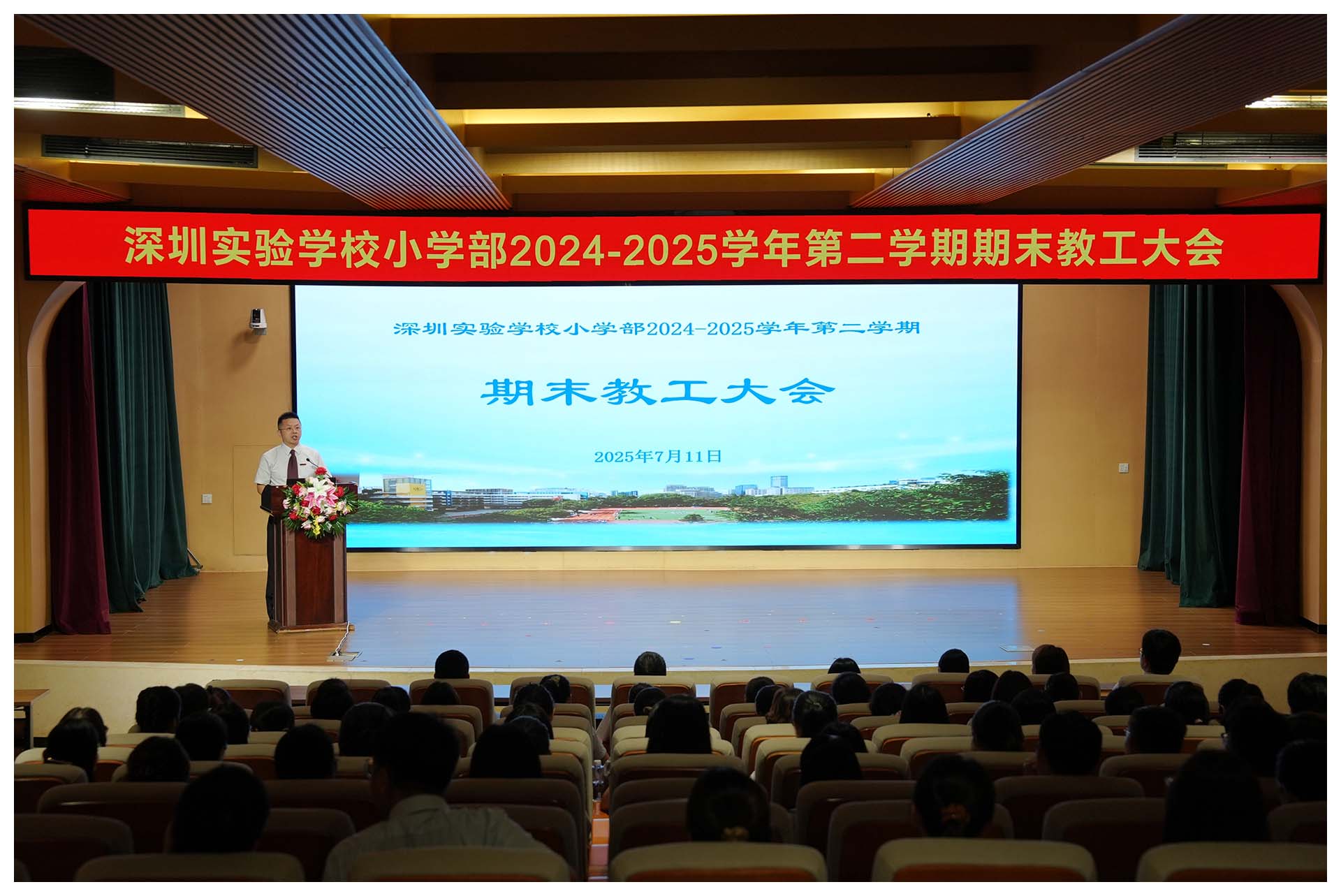 夏木苍翠,远山如碧。2025年7月11日,深圳实验学校小学部召开2024-2025学年第二学期期末教工大会。小学部全体教工与各班家长代表齐聚一堂,以“四秩励精图治路 群英奋楫向新程”为主题,回望总结了学校在教育教学、团队建设、家校合作等方面的教育历程。