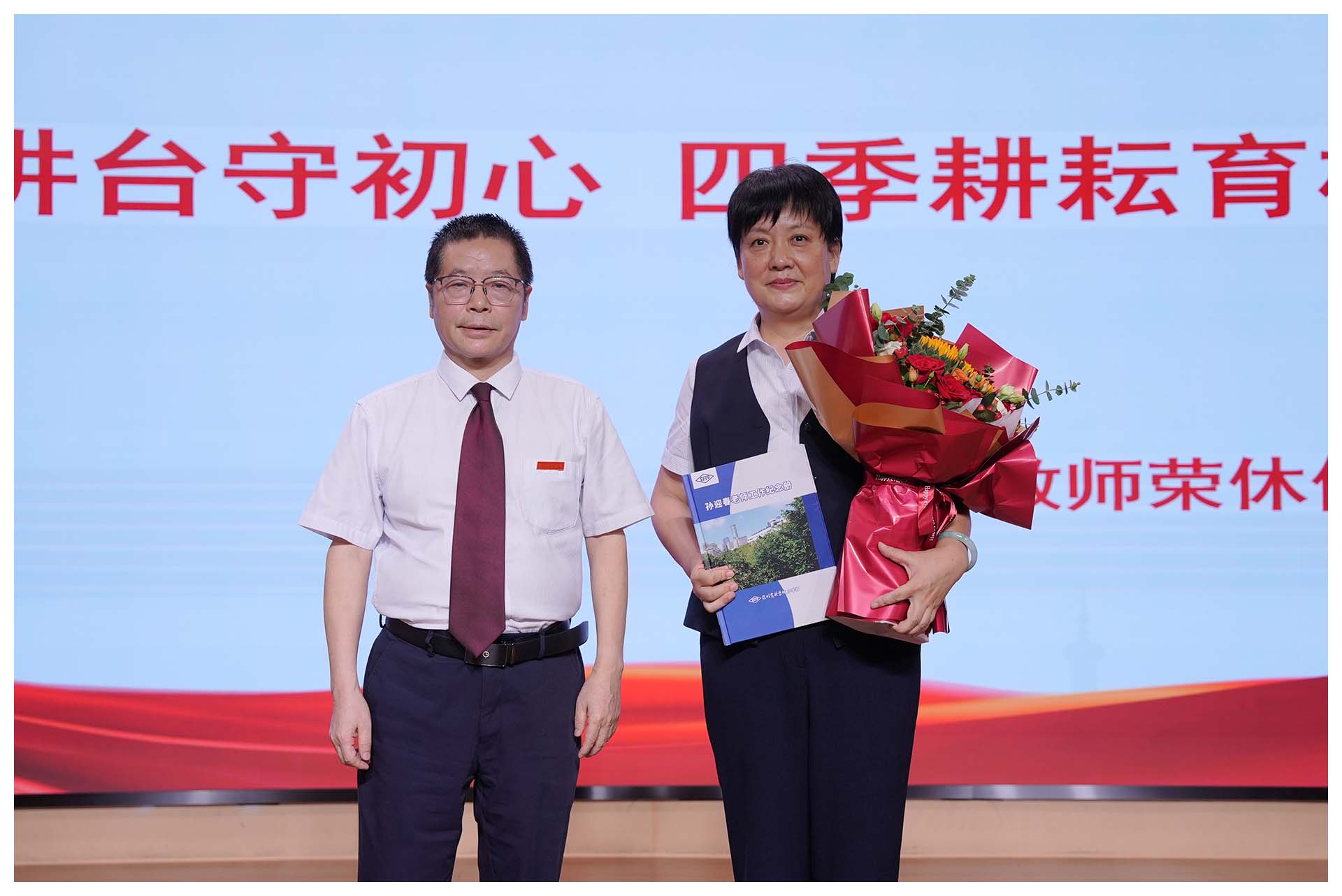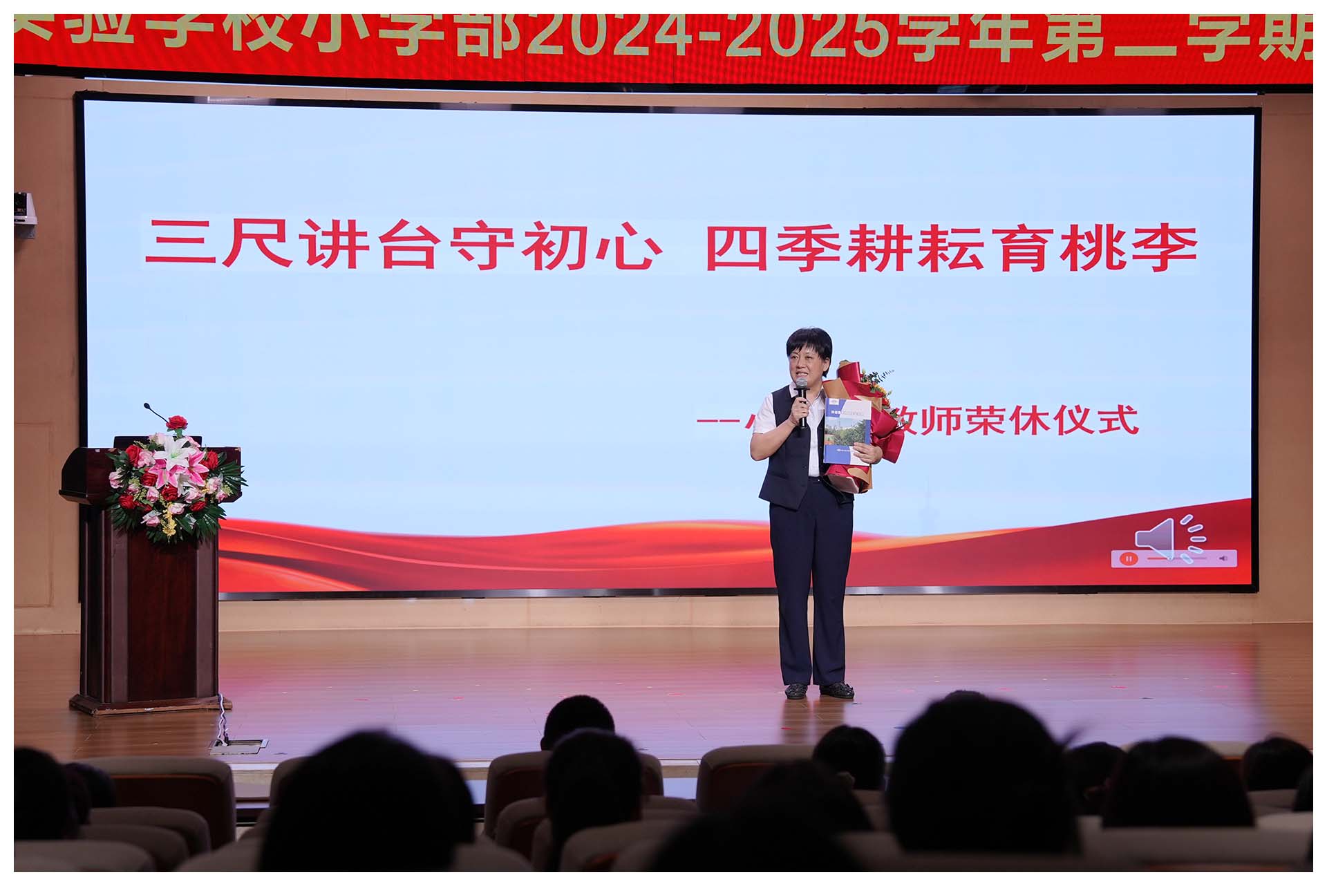 三尺讲台守初心,四季耕耘育桃李。潜心躬耕教坛37年,孙迎春老师迎来了她的荣休时刻,即将开启人生的另一段美好旅程,大会为孙老师举行了温暖的荣休仪式。会上,吴立新校长代表学校为孙老师赠送鲜花和纪念册,感谢孙老师为学生和青年教师成长尽心尽力,为学校发展勇挑重担。同事们献上祝福的掌声。孙老师表达了对学校的感谢和对未来生活的期待,以及对实验未来的期许,真诚的话语凝聚着薪火相传的实验精神。