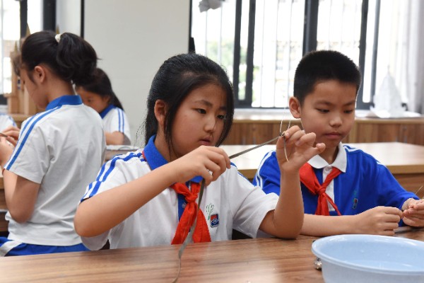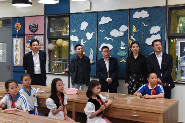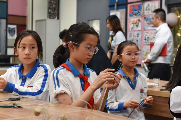 与此同时,旁边的美术教室里,黎兵老师指导的非遗草编社团正用草木编织着时光,引来领导和嘉宾们的一致称许。花鸟鱼虫的绿意与珐琅徽章的星芒交相辉映,共同织就实验美育的经纬长卷。