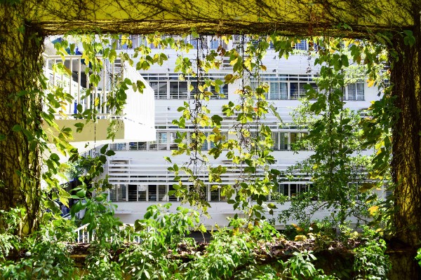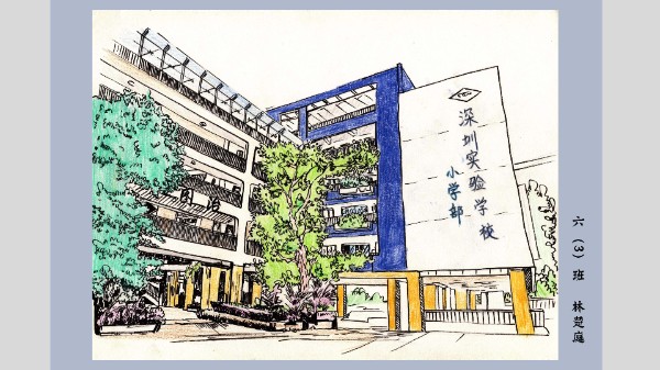 教学楼的窗户眨着眼睛,簕杜鹃绽放着灿烂的笑颜,I Love SZSY仿佛彩虹积木塔。