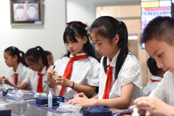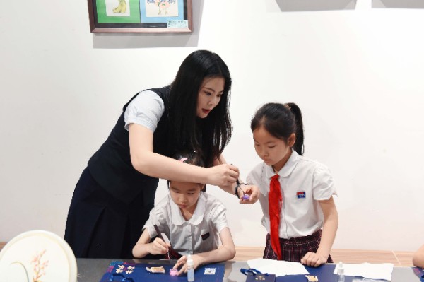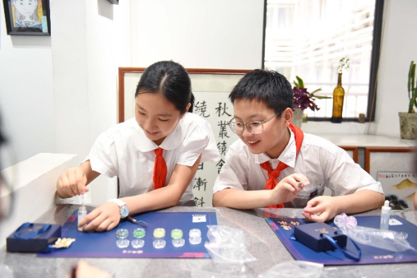日影西斜时,美术馆化身为非遗工坊。“纹韵实验·锦绣华章”校庆珐琅徽章创作体验开启了当天活动的新篇章。深圳景之蓝文创的常老师为现场四十名学生代表讲解珐琅工艺“掐丝点蓝”的绝技。一年级的桐菲紧握刮刀,在王冰老师的指导下,往金丝勾勒中小心翼翼地填入闪烁着宝石般光泽的釉料。